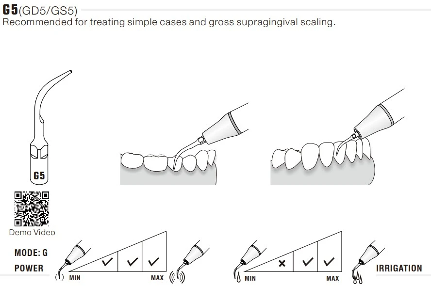 Końcówka ultradźwiękowa Woodpecker G5 to narzędzie przeznaczone do skalingu naddziąsłowego w stomatologii zachowawczej i profilaktyce. Oznaczenie „G” wskazuje na zastosowanie w stomatologii ogólnej (scaling). Zgodnie z informacją producenta model G5 jest rekomendowany do leczenia prostych przypadków oraz do intensywnego skalingu naddziąsłowego (gross supragingival scaling).