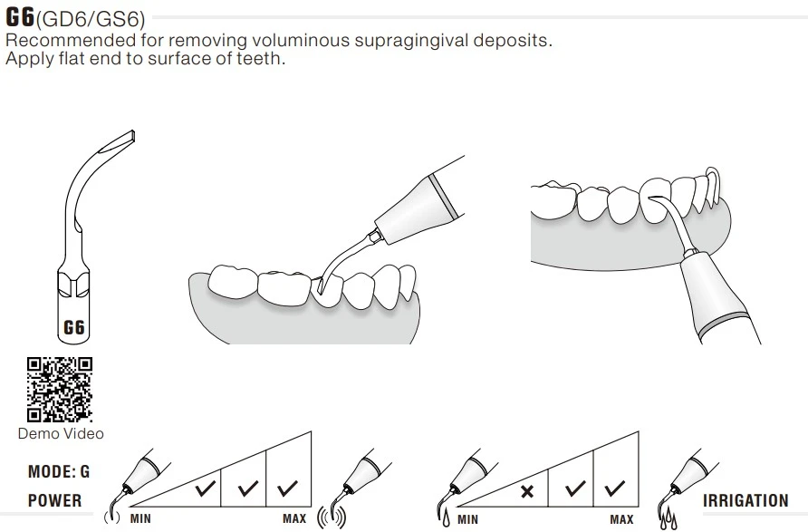 Końcówka ultradźwiękowa Woodpecker G6 to końcówka skalingowa przeznaczona do pracy ze skalerami ultradźwiękowymi w standardzie EMS (E-Type). Oznaczenie „G” wskazuje na zastosowanie w stomatologii zachowawczej i profilaktyce (scaling). Zgodnie z informacją producenta model G6 jest rekomendowany do usuwania masywnych złogów naddziąsłowych, a podczas pracy należy przykładać płaską część końcówki do powierzchni zęba.