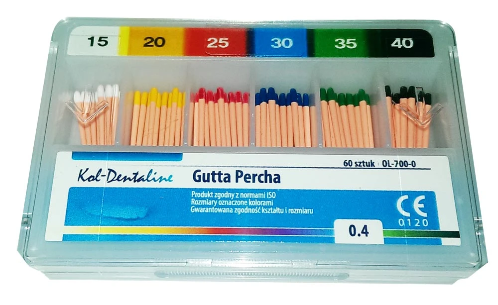 Ćwieki gutaperkowe do uszczelniania kanałów korzeniowych.