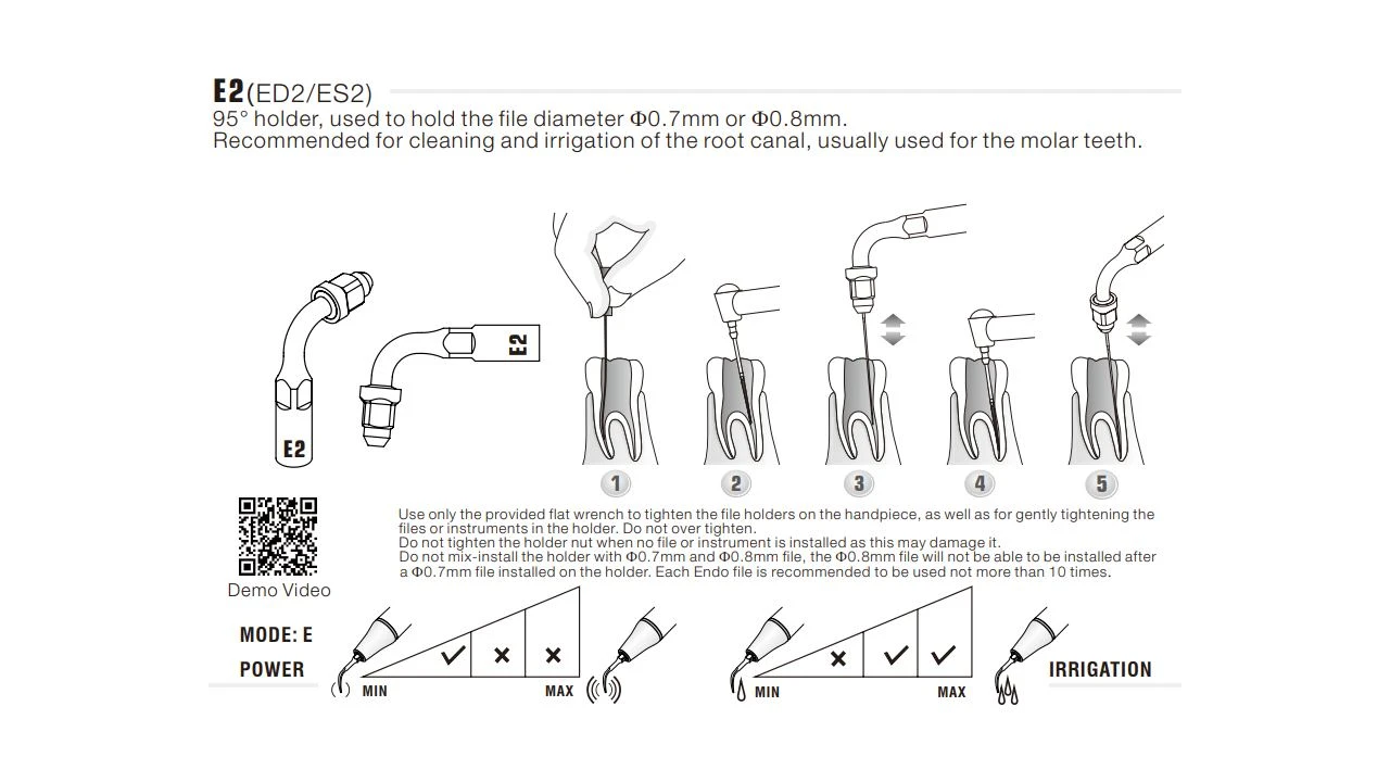Końcówka ultradźwiękowa Woodpecker E2 to profesjonalny uchwyt endo 95° typu endo-chuck, przeznaczony do pracy w systemie EMS E-Type oraz urządzeniach Woodpecker (seria UDS). Geometria 95° (kąt zbliżony do prostego) jest szczególnie przydatna w odcinkach bocznych – w zębach przedtrzonowych i trzonowych – gdzie przy ograniczonym rozwarciu szczęki umożliwia precyzyjne wprowadzenie narzędzia do kanału. Końcówka przeznaczona jest do aktywacji irygantów oraz irygacji kanałów korzeniowych.