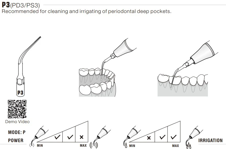 Końcówka ultradźwiękowa Woodpecker P3 to profesjonalna końcówka periodontologiczna przeznaczona do pracy ze skalerami ultradźwiękowymi w standardzie EMS (E-Type). Oznaczenie „P” wskazuje na zastosowanie w periodontologii, natomiast cyfra „3” określa wariant konstrukcyjny w serii perio. Model P3 jest rekomendowany do oczyszczania i irygacji głębokich kieszonek przyzębnych (cleaning and irrigating of periodontal deep pockets). Smukła, odpowiednio wyprofilowana część robocza umożliwia precyzyjną pracę w obszarach poddziąsłowych.