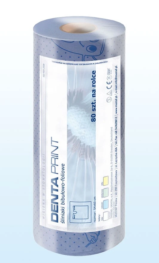 Śliniaki wiązane Denta-Print niebieskie 54x60cm rolka 80szt. Mustaf bibulowo-foliowe z nadrukiem