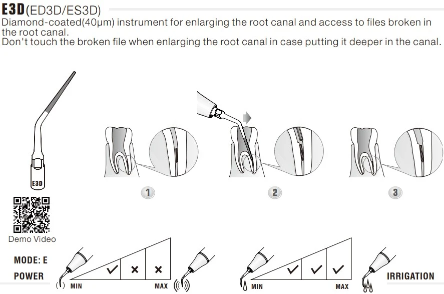 Końcówka ultradźwiękowa Woodpecker P3D to specjalistyczna końcówka periodontologiczna z nasypem diamentowym o gradacji 40 µm, przeznaczona do pracy ze skalerami w standardzie EMS E-Type. Oznaczenie „P” wskazuje na zastosowanie w periodontologii, natomiast litera „D” występująca po cyfrze oznacza pokrycie diamentowe. Model P3D jest przeznaczony do wygładzania powierzchni korzeni po zabiegu płatowym (periodontal flap surgery) oraz do opracowywania furkacji i wykańczania brzegów koron protetycznych (edge planing).