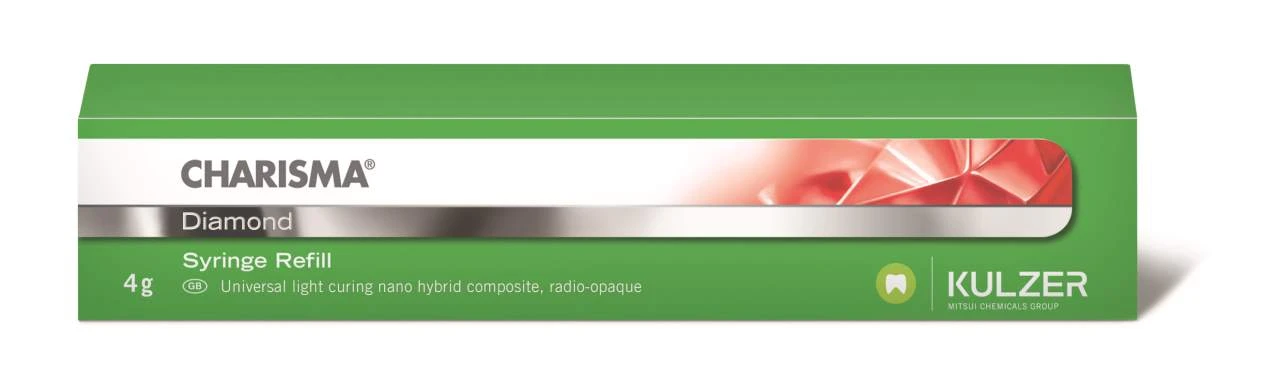 Charisma Diamond obejmuje 21 uniwersalnych kolorów, 4 nieprzezierne kolory masy zębinowej oraz 4 kolory masy siecznej.