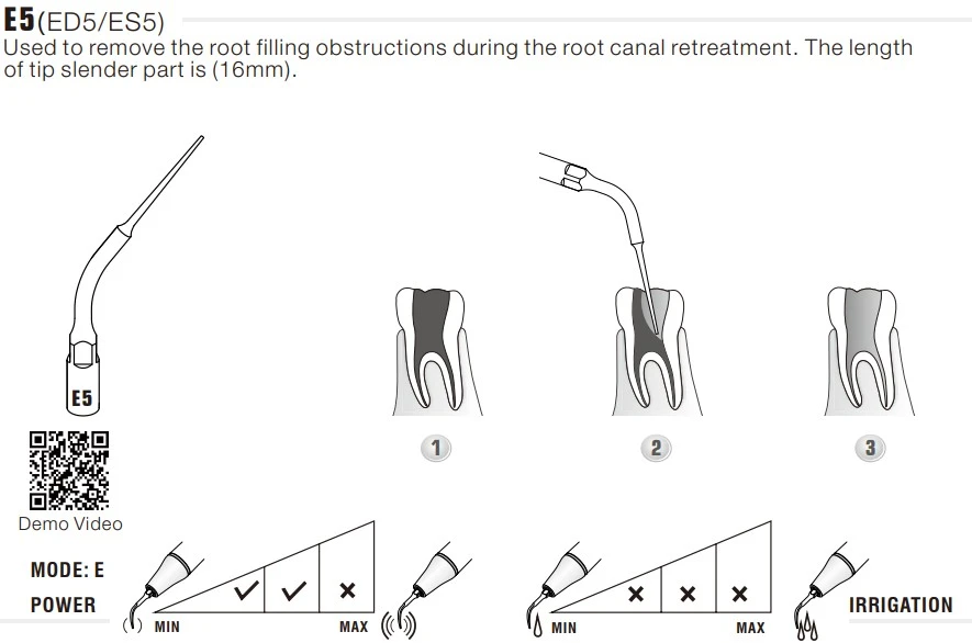 Końcówka ultradźwiękowa Woodpecker E5 to narzędzie endodontyczne przeznaczone do pracy podczas powtórnego leczenia kanałowego (root canal retreatment). Oznaczenie „E” wskazuje na zastosowanie w endodoncji. Zgodnie z informacją producenta końcówka służy do usuwania przeszkód z wypełnienia kanału korzeniowego podczas zabiegów retreatmentu. Konstrukcja końcówki została zoptymalizowana do pracy głównie w przykoronowej jednej trzeciej kanału (coronal third). Smukła część robocza o długości 16 mm umożliwia precyzyjne opracowywanie materiałów wypełniających zalegających w początkowym odcinku kanału.