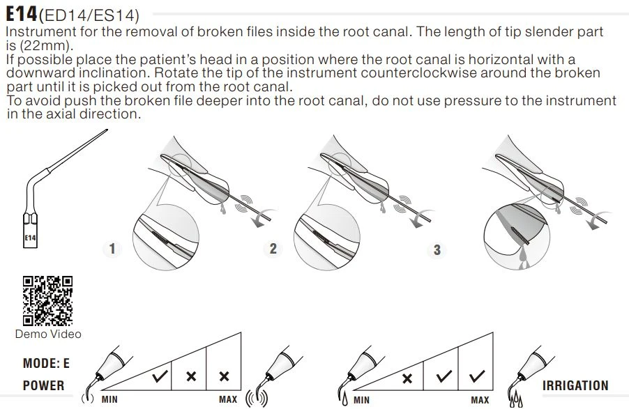 Końcówka ultradźwiękowa Woodpecker E14 to specjalistyczne narzędzie endodontyczne przeznaczone do pracy ze skalerami w standardzie EMS E-Type. Służy do usuwania złamanych i zablokowanych narzędzi z wnętrza kanału korzeniowego. Smukła część robocza o długości 22 mm umożliwia precyzyjną pracę w głębokich odcinkach systemu kanałowego. Końcówka stosowana jest ze sprayem wodnym, zgodnie z zaleceniami producenta.