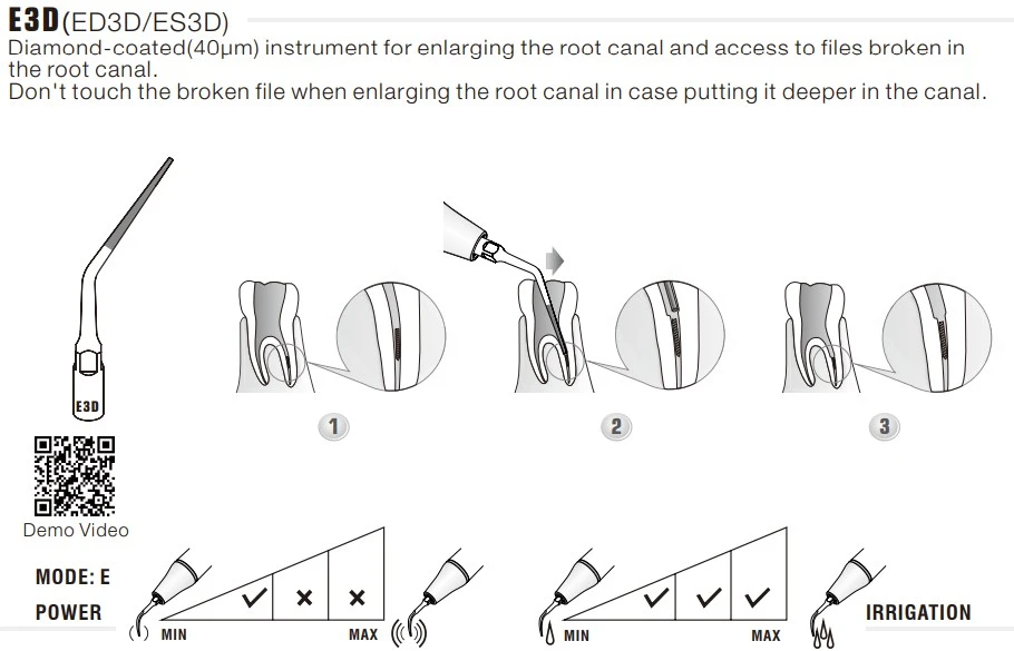 Końcówka ultradźwiękowa Woodpecker E3D to specjalistyczne narzędzie endodontyczne z nasypem diamentowym 40 µm, przeznaczone do uplastyczniania gutaperki podczas wypełniania kanału korzeniowego. Oznaczenie „E” wskazuje na zastosowanie w endodoncji, natomiast litera „D” po cyfrze oznacza pokrycie diamentowe części roboczej. Zgodnie z informacją producenta model E3D rekomendowany jest do uplastyczniania gutaperki (melting gutta-percha) z wykorzystaniem drgań ultradźwiękowych.