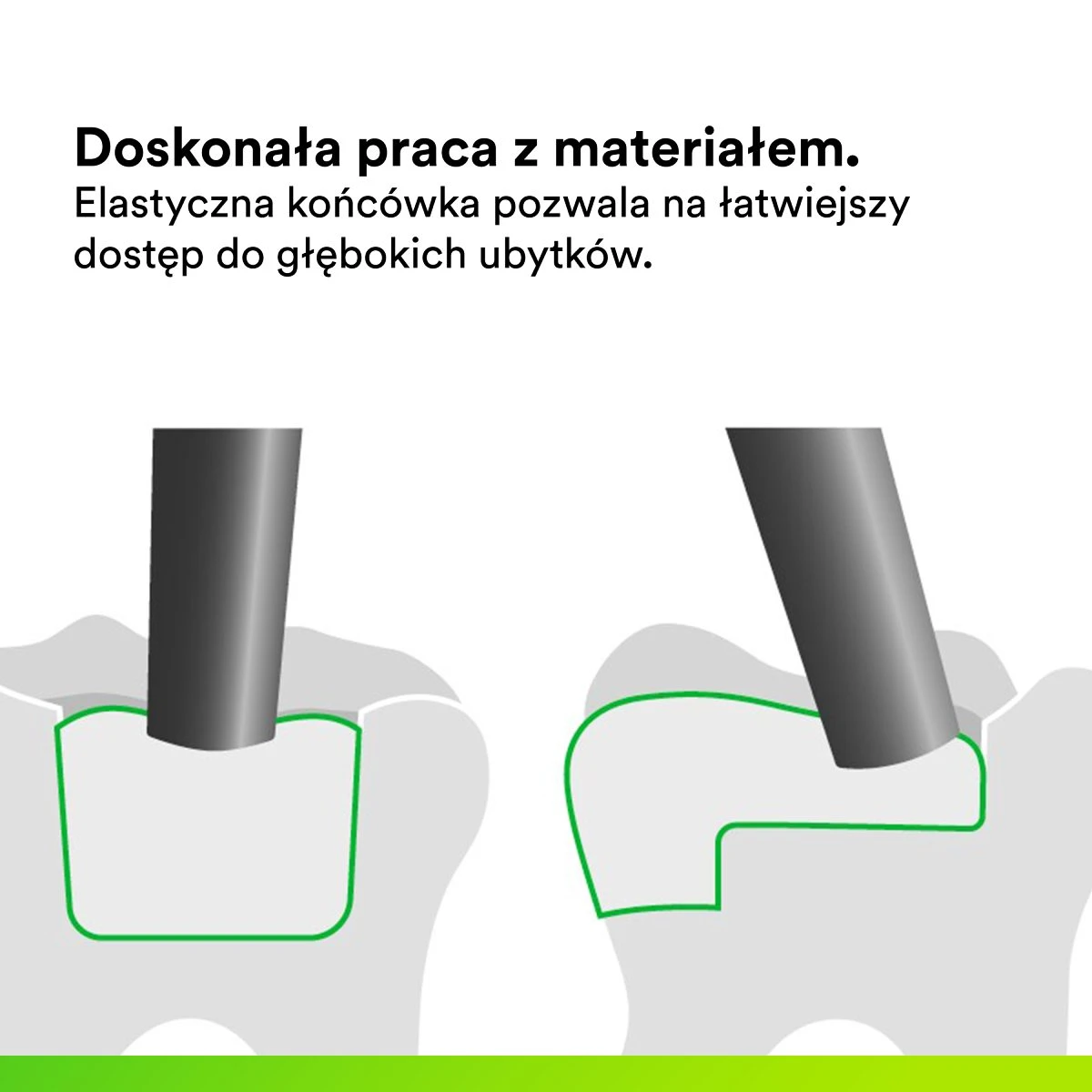 • Unikalny kształt końcówki aplikacyjnej dla łatwiejszego dostępu do głębokich ubytków