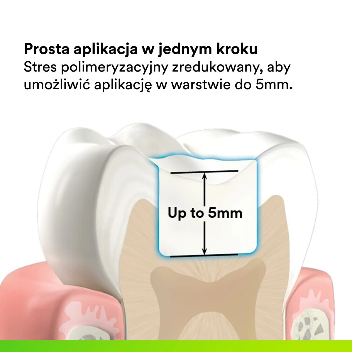 • Unikalny kształt końcówki aplikacyjnej dla łatwiejszego dostępu do głębokich ubytków