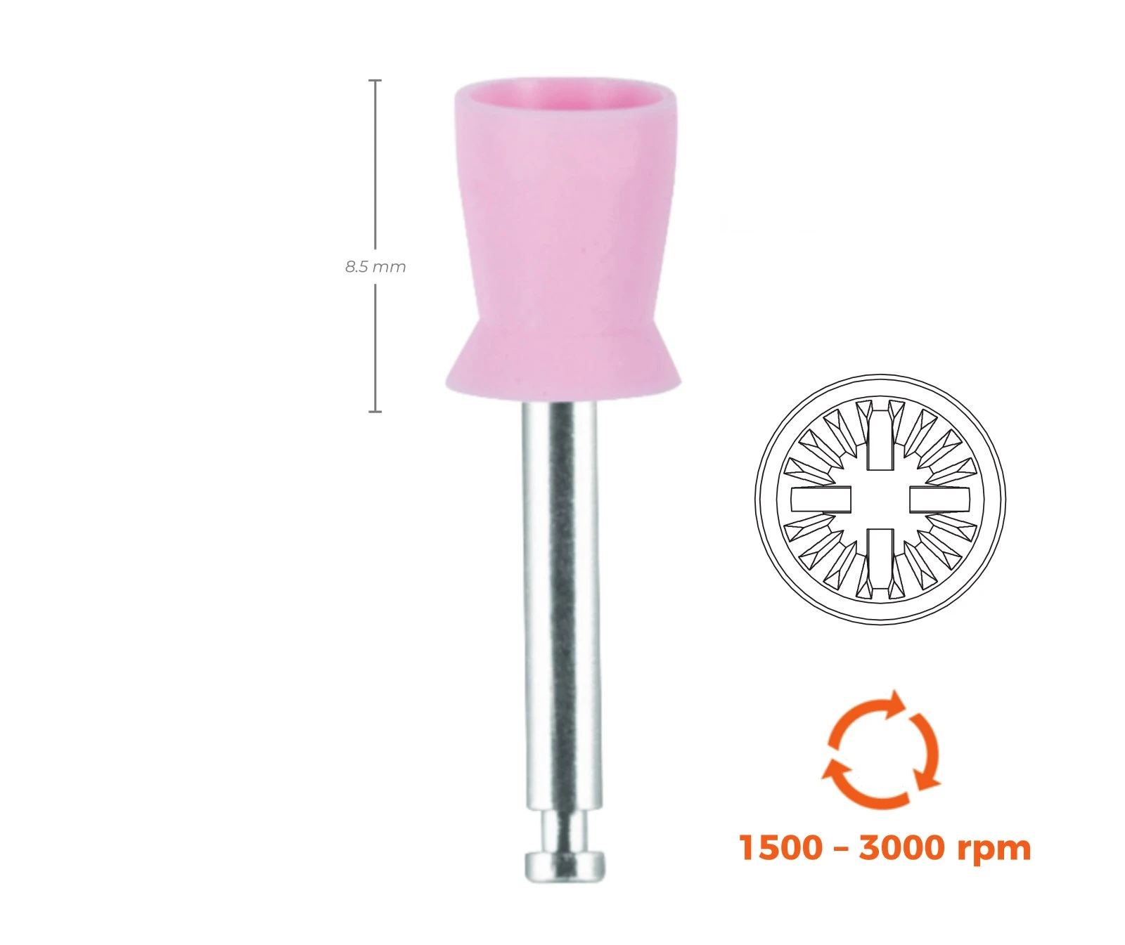 Jednorazowe gumki do polerowania Premium Plus posiadają 4 żebra i wewnętrzne blaszki, które zapewniają dostarczanie optymalnej ilość pasty polerskiej. Kubek ma również zdolność „rozpłaszczania się”, przy delikatnym dociśnięciu, dzięki czemu dociera do obszarów międzyzębowych i poddziąsłowych.