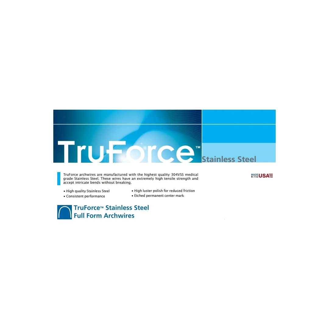 Łuki Stalowe TruForce 018 dół forma euro. Łuki produkowane z najwyższej jakość stali medycznej typu 304v. Wytrzymują najróżniejszego rodzaju wygięcia bez łamania się oraz mają wyjątkowo dużą siłę ciągnącą. Bardzo wysoka jakość stali, stała siła, idealne wykończenie redukujące tarcie, zaznaczony środek łuku.