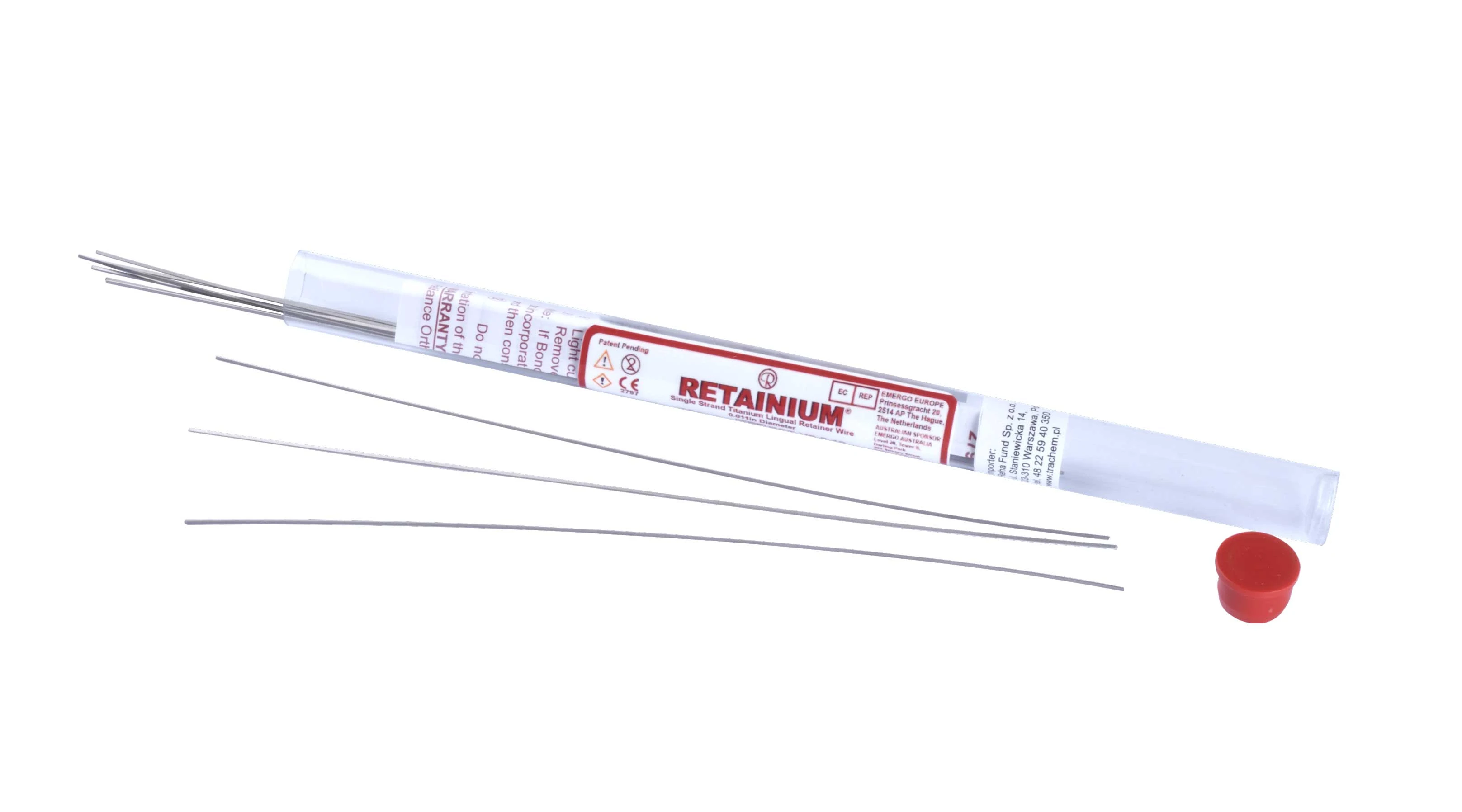 Retainium jest pojedynczą, bezniklową, tytanową, płaską taśmą o zwiększonej wytrzymałości. Retainium eliminuje potencjalne problemy z alergią pacjentów na nikiel i ma zmniejszony współczynnik zużycia. Rozmiar 6". Drut do stoowania jako retainer językowy do utrzymywania pozycji zębów po leczeniu ortodontycznym
