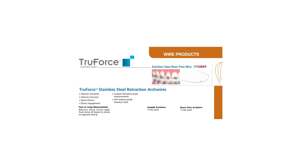 Łuki Stalowe retrakcyjne TruForce 017x025 łuk 24.0 mm ze słupkami. Łuk stosowany przy intruzji zębów przednich, zamykania przestrzeni międzyzębowych. Stosowane przy cofaniu zębów przednich. Formowanie na potrzeby klienta. Wysoka jakość stali - 304v