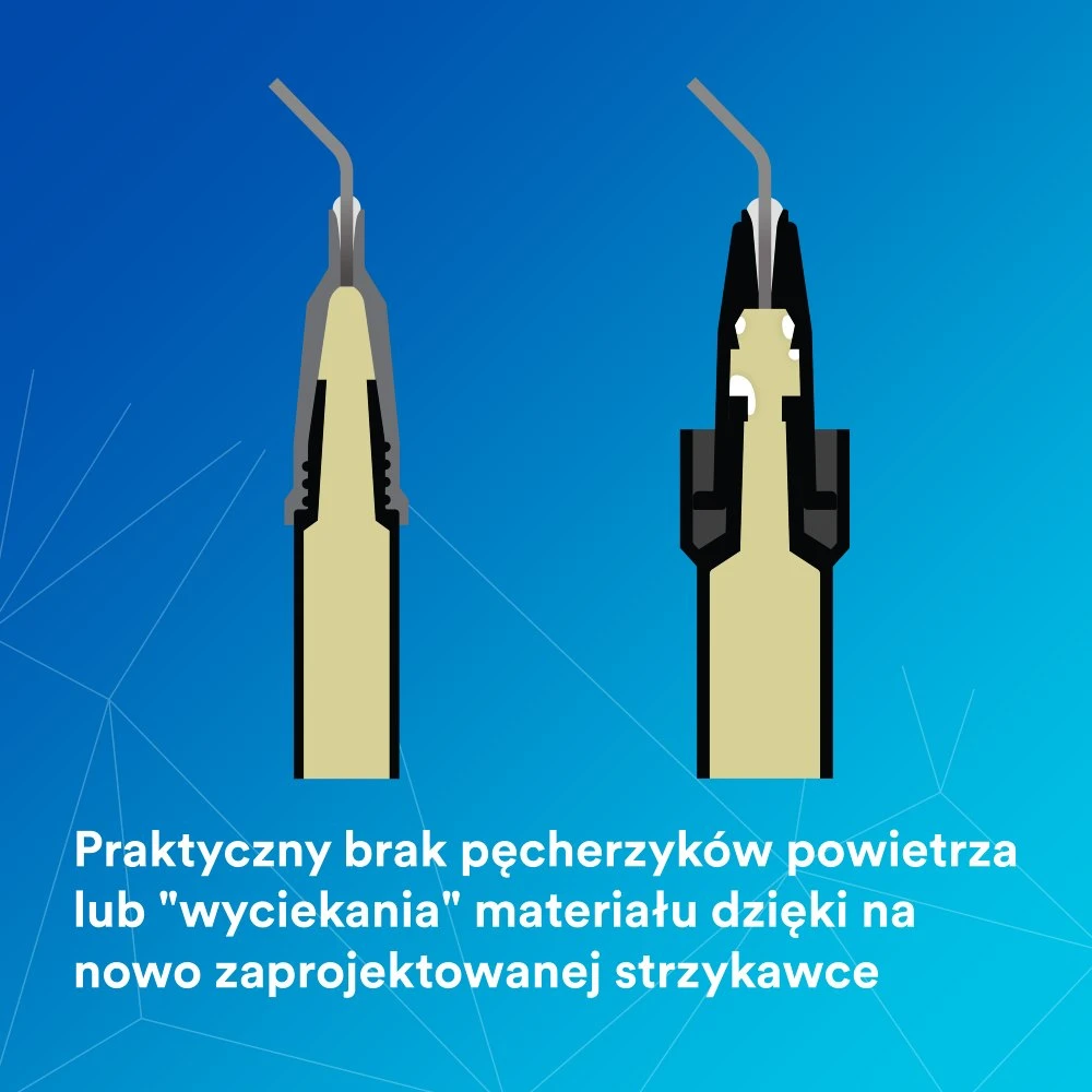 - Łatwo zginająca się kaniula dla lepszego dostępu do ubytku.