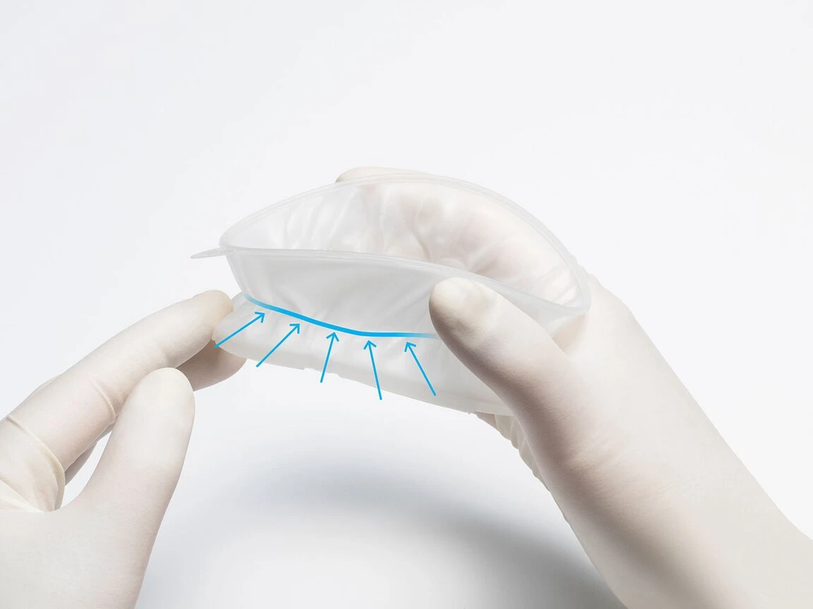 Retraktor wykonano z miękkiego, elastycznego materiału, który idealnie dopasowuje się do anatomii jamy ustnej pacjenta. Materiał ten jest całkowicie bezlateksowy, co jest szczególnie ważne dla osób cierpiących na alergię na lateks, a także zwiększa bezpieczeństwo użytkowania. Jego elastyczność pozwala na komfortową aplikację oraz łatwe usunięcie, co dodatkowo usprawnia pracę personelu stomatologicznego.