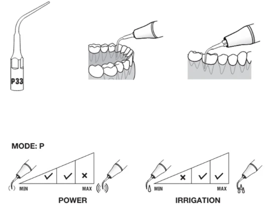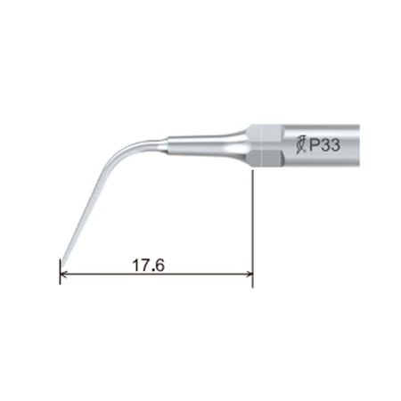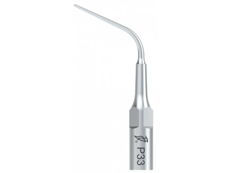Końcówka ultradźwiękowa Woodpecker P33 to końcówka periodontologiczna przeznaczona do pracy ze skalerami ultradźwiękowymi w standardzie EMS (E-Type). Oznaczenie „P” wskazuje na zastosowanie w periodontologii. Zgodnie z informacją producenta końcówka jest przeznaczona do usuwania kamienia z głębokich kieszonek przyzębnych oraz do płukania (irygacji) kieszonki przyzębnej. Smukła konstrukcja umożliwia delikatne opracowywanie poddziąsłowej powierzchni korzeni.