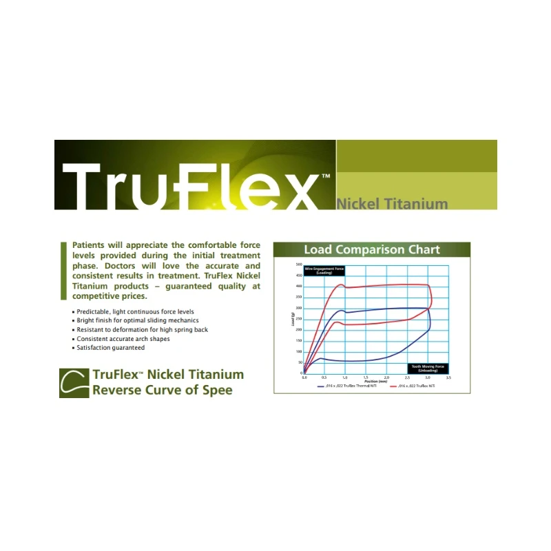 TruFlex Łuk niklowo-tytanowy kolebkowy ( odwrotna krzywa spee). Super elastyczność i stała siła. Skuteczne poziomowanie, szeregowanie i poszeżanie łuku dolnego.