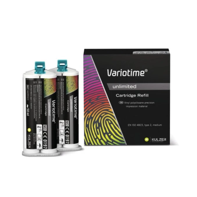 VarioTime Unlimited 2×50 ml Refill to uzupełniający zestaw silikonowego materiału wyciskowego typu A (addycyjnego), przeznaczony do wykonywania precyzyjnych wycisków protetycznych w stomatologii. Refill stanowi praktyczne rozwiązanie do regularnego stosowania materiału w gabinecie.