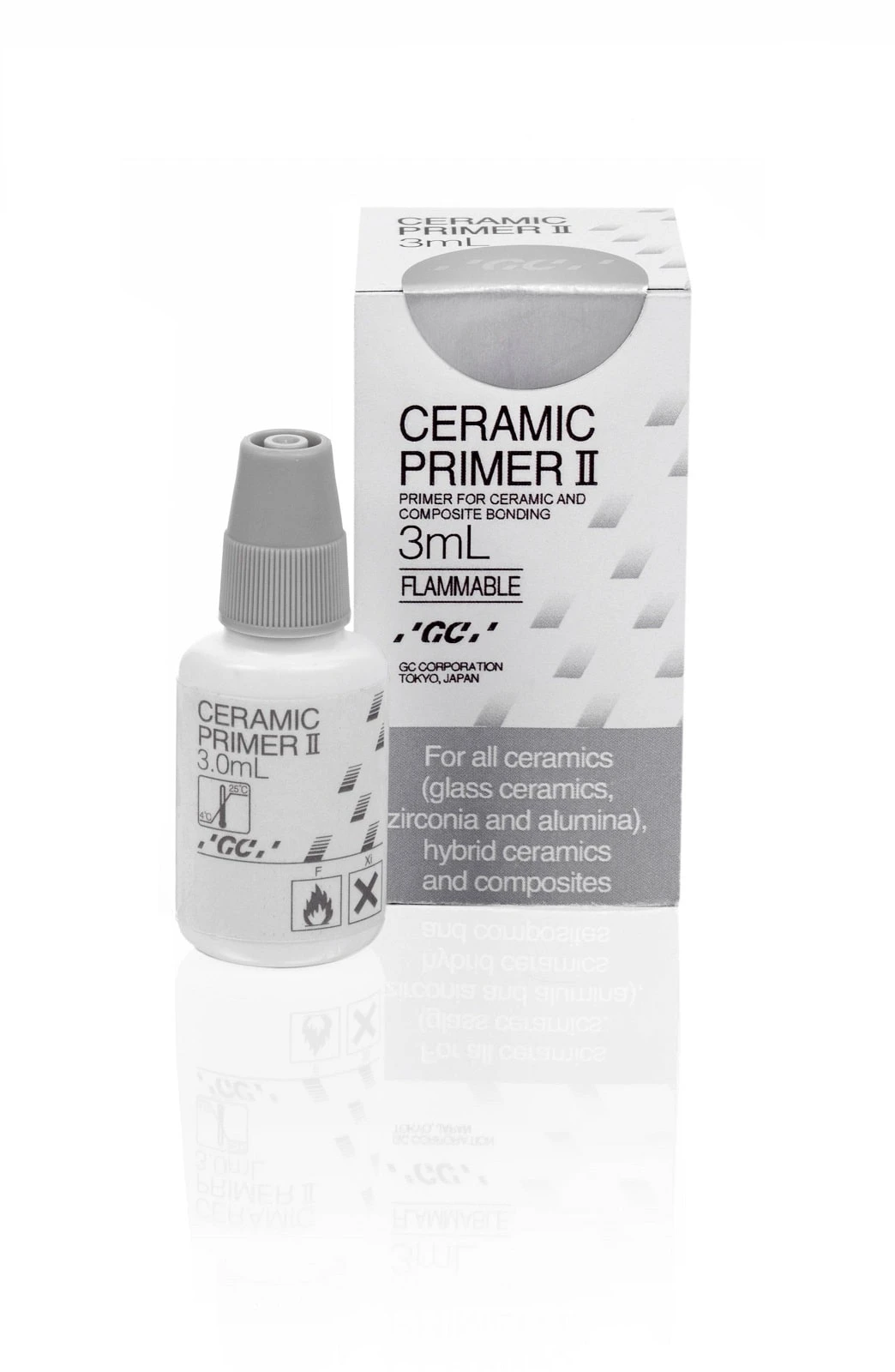 CERAMIC PRIMER II jest środkiem typu primer przeznaczonym do przygotowania przewidzianych do łączenia powierzchni ceramicznych i kompozytowych uzupełnień protetycznych w celu wzmocnienia wiązania z materiałami na bazie żywic, takimi jak cementy na bazie żywic w przypadku procedur cementowania lub kompozyty do bezpośredniego stosowania w jamie ustnej w przypadku napraw.